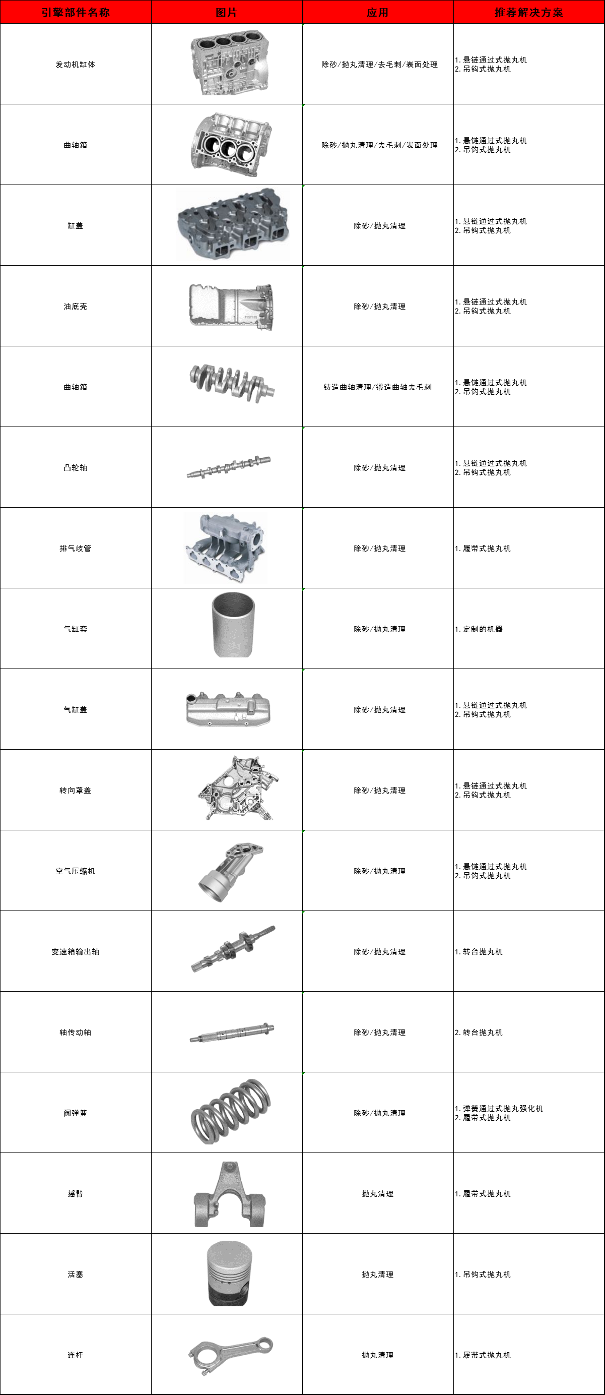 1.發動機缸體,曲軸箱,缸蓋;2.油底殼,曲軸,凸輪軸;3.排氣歧管,氣缸套;4.氣缸蓋,轉向罩蓋;5.空氣壓縮機,變速箱輸出軸;6.軸傳動軸,閥彈簧,搖臂。具體請提供工件的尺寸和生產量等信息,我方工程師會為您定制產品方案